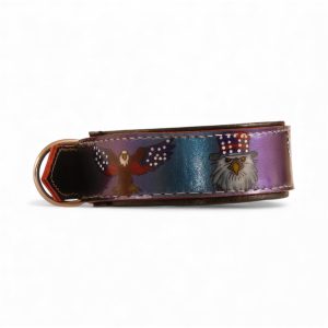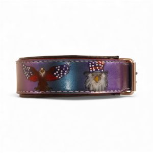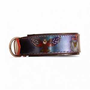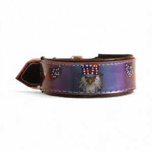 It’s a handmade leather collar that features bold American bald eagles with the American flag’s stars and stripes worked into the design.
