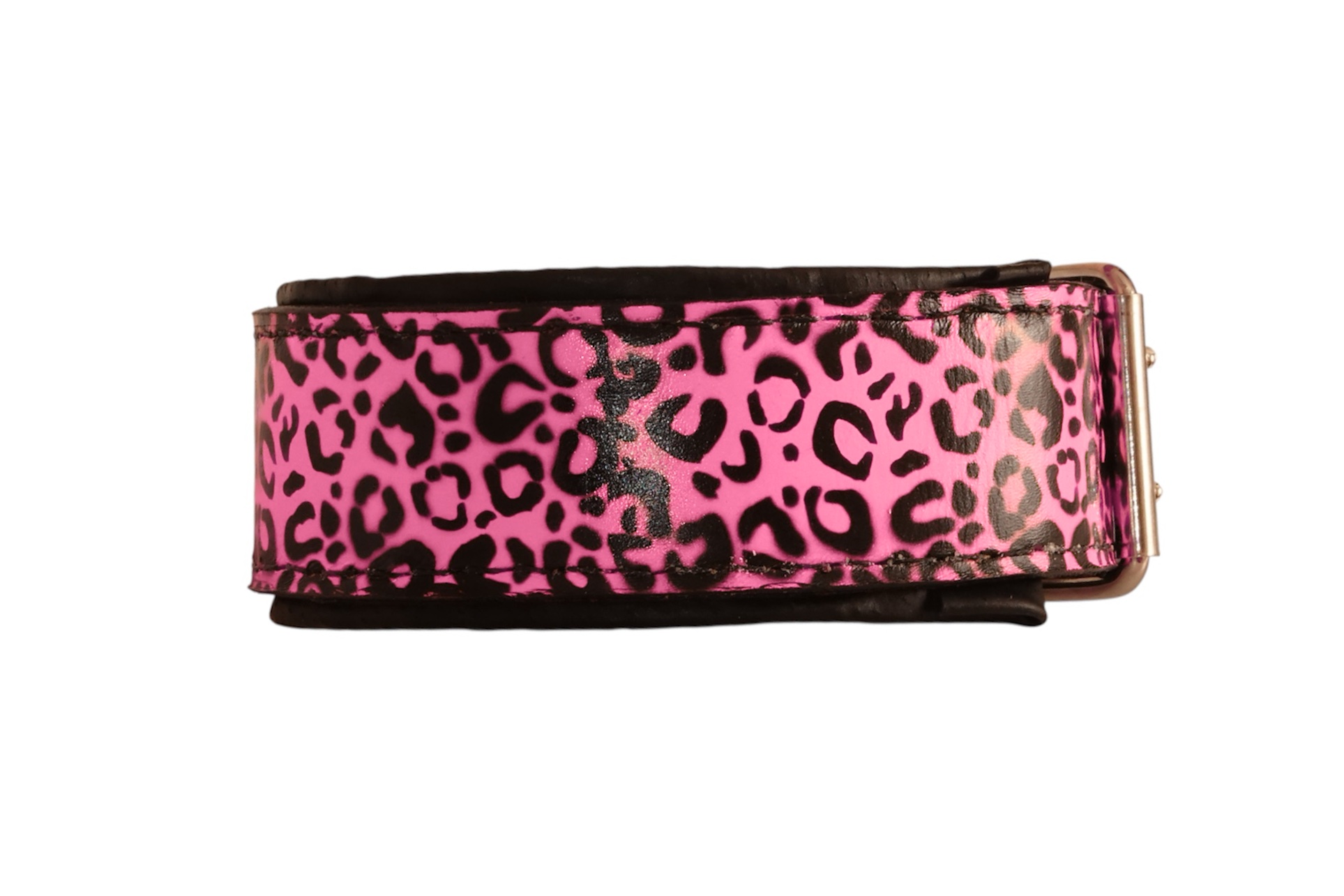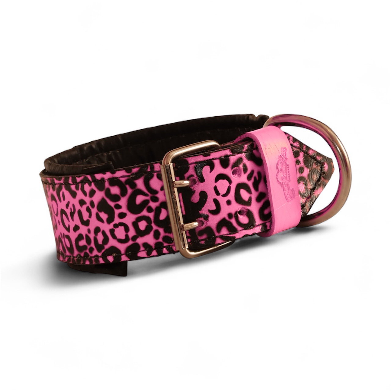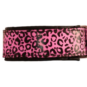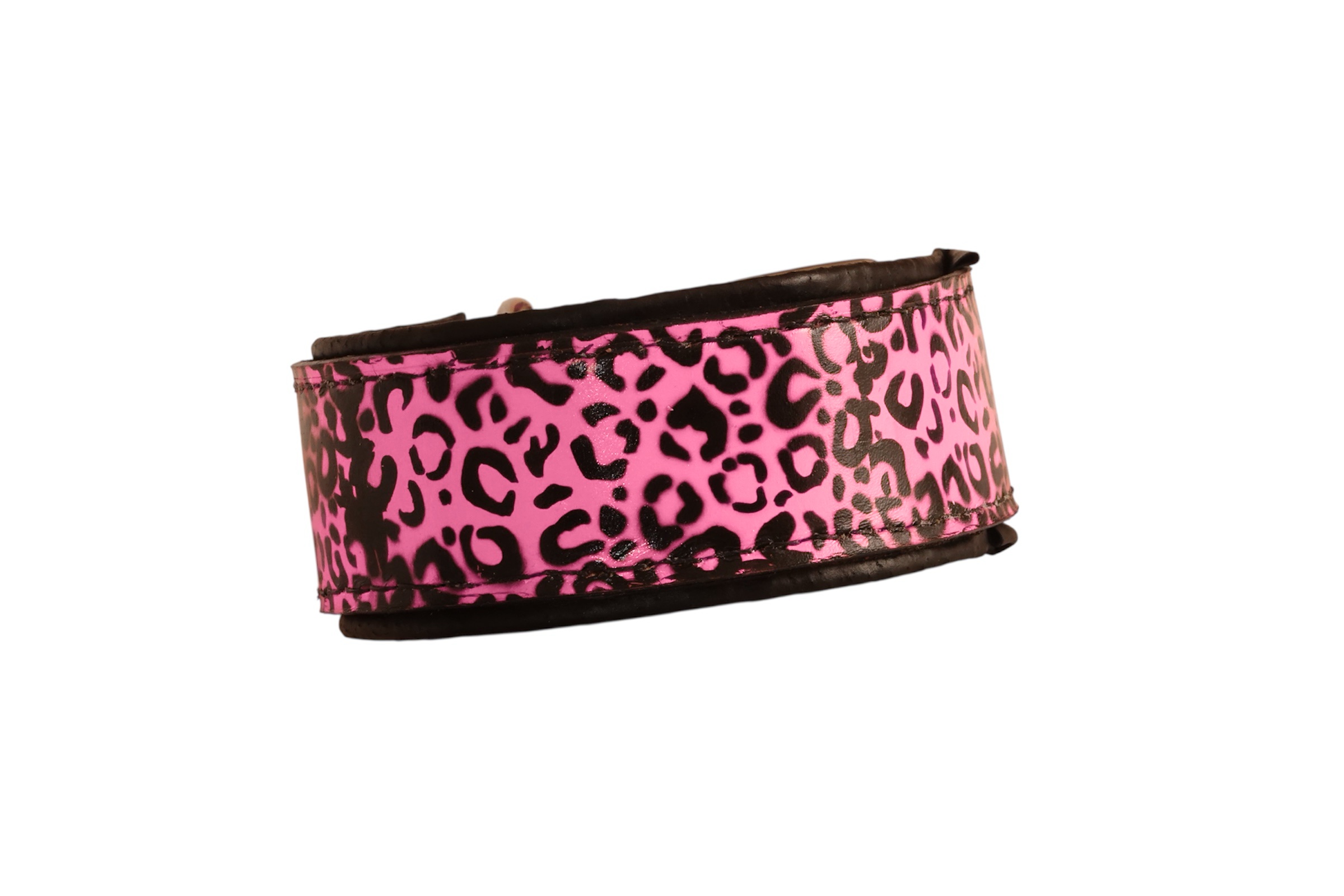 Leather Dog Collar with a handmade leopard pattern in black and pink colors. Black soft padding