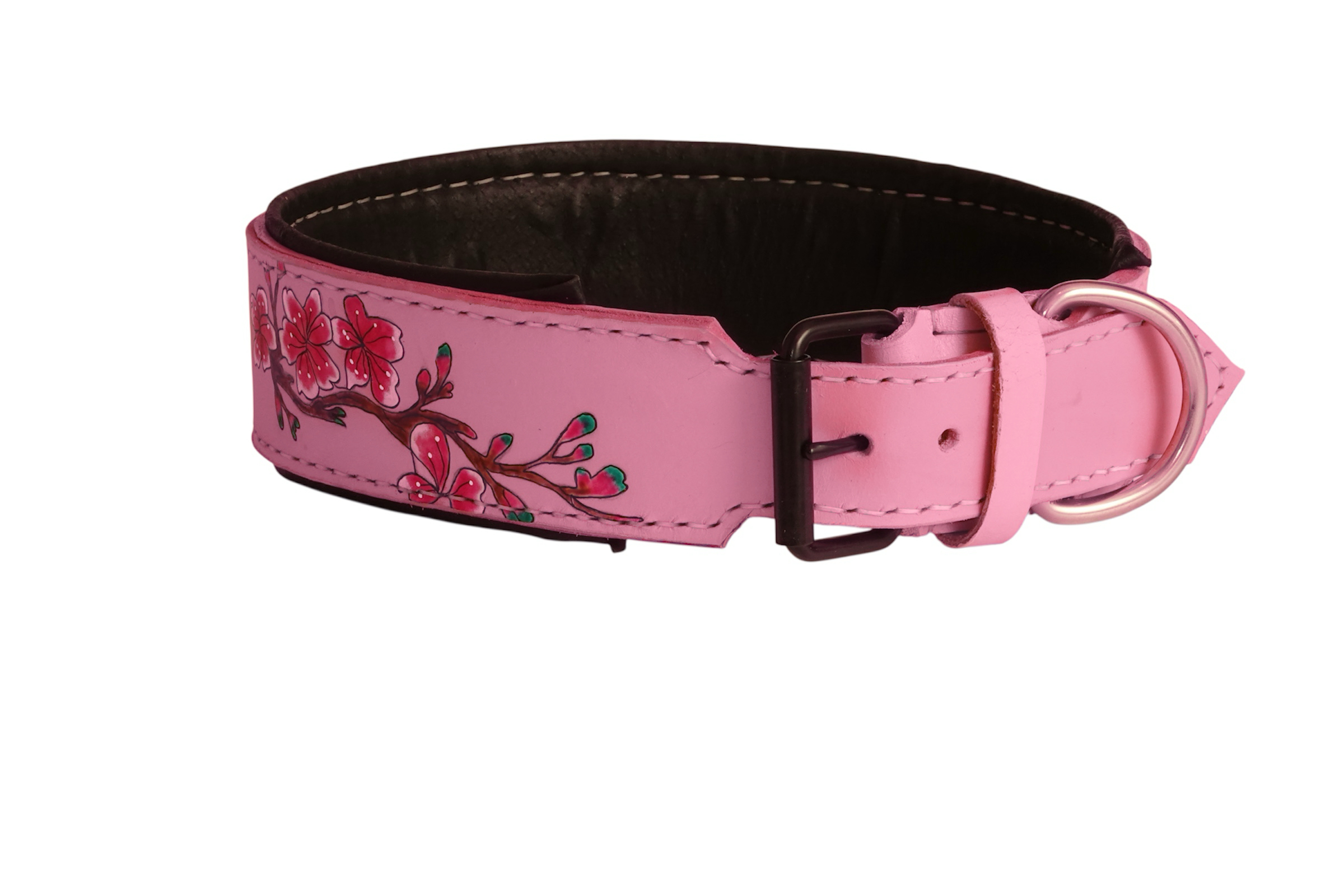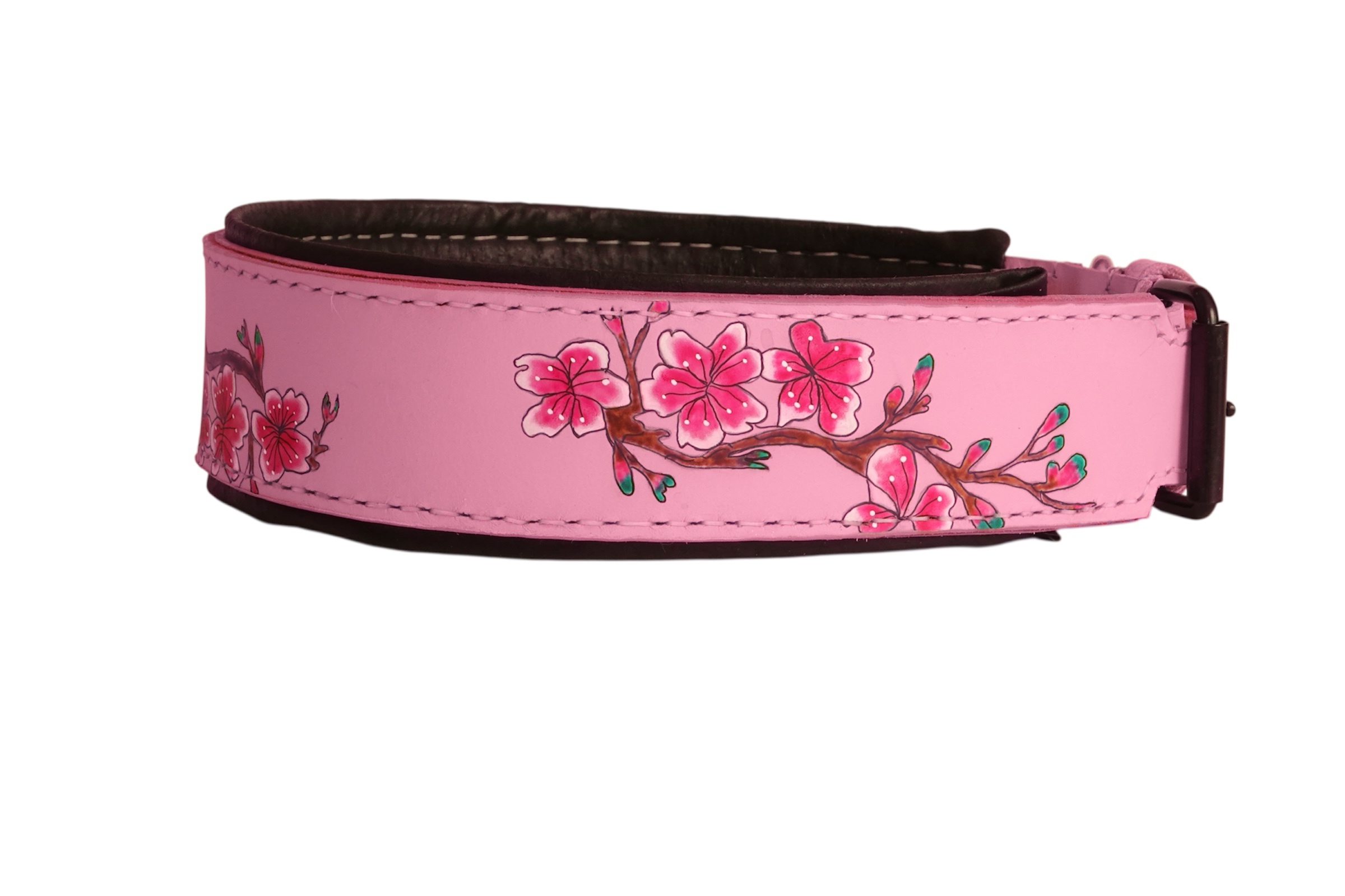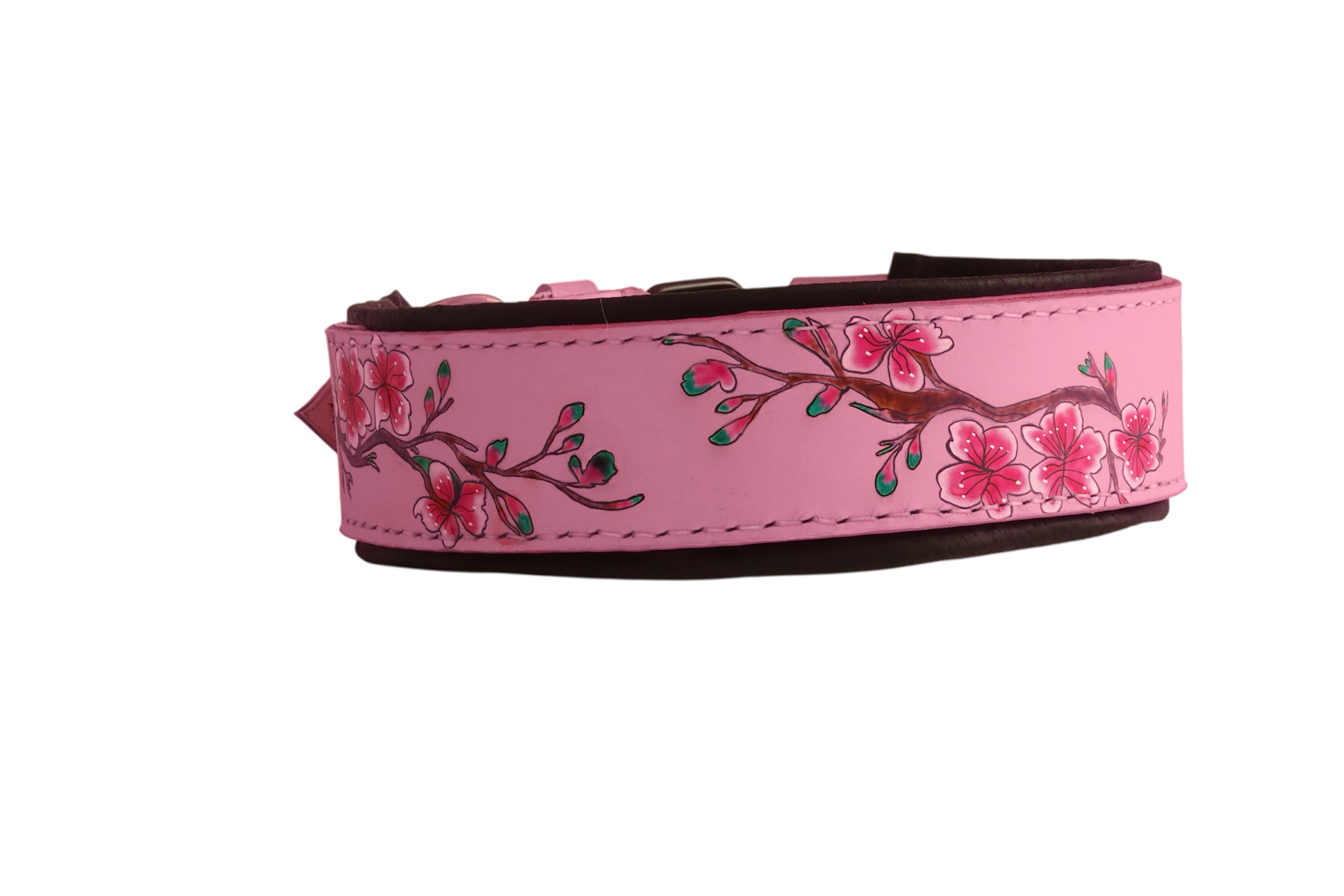 Handmade Pink Leather Dog Collar with Cherry Blossom Airbrush Design